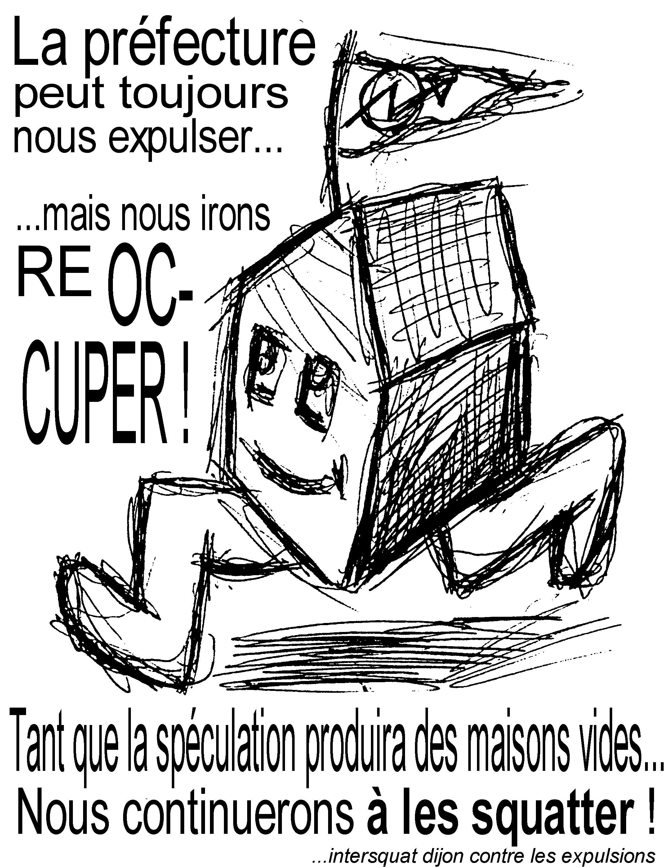 Regroupés au sein de l'Intersquat Dijon, nous nous opposons à la mort de ces lieux squattés. De plus, des centaines de personnes (squatteurs et squatteuses, mais aussi locataires ne pouvant payer leur loyer, sans-papiers...) sont jeté-e-s à la rue chaque année, par les soins de la préfecture. Il nous semble donc particulièrement important de lui rappeler notre vive opposition à sa fonction répressive.
